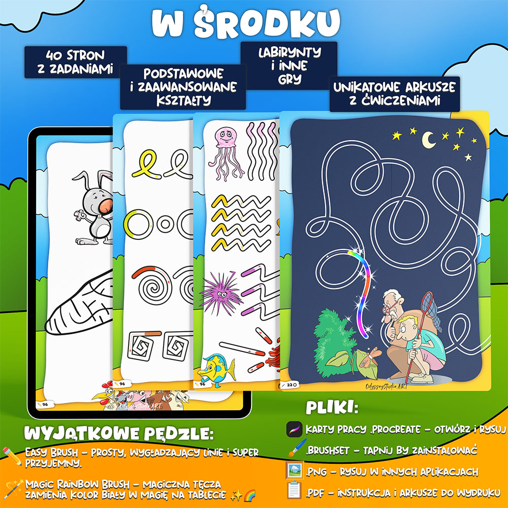 Nie masz Procreate? Użyj plików .png i swoich ulubionych pędzli w innej aplikacji do rysowania. Możesz też skorzystać z dołączonego pliku pdf, wydrukować karty pracy i rysować z dzieckiem na tradycyjnych kartkach. Do śledzenia szlaczków na ciemnych stronach przydadzą się pisaki żelowe lub specjalne kredki do rysowania na czerni.