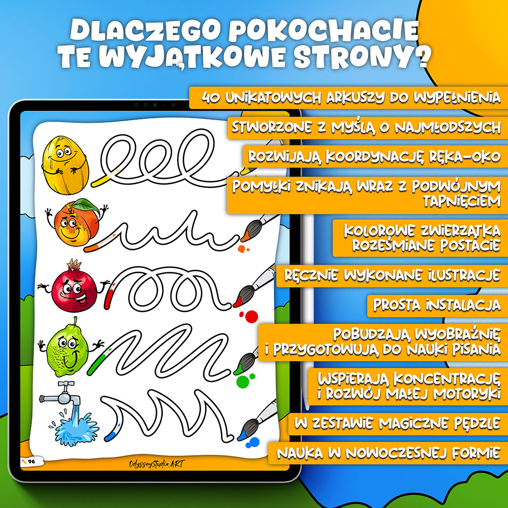 Skoro dzieci i tak spędzają czas przy tabletach, dajmy im narzędzie, które rozwija, a nie ogłupia. Zamiast biernego oglądania ekranów – twórcze działanie. Zamiast scrollowania – rozwój motoryki i wyobraźni. Ten kolorowy zestaw szlaczków zamienia czas przed tabletem w mądrą, edukacyjną przygodę. To innowacyjny produkt, który łączy to, co dzieci lubią – ekran i rysowanie – z tym, co rodzice cenią najbardziej – rozwój i bezpieczeństwo.