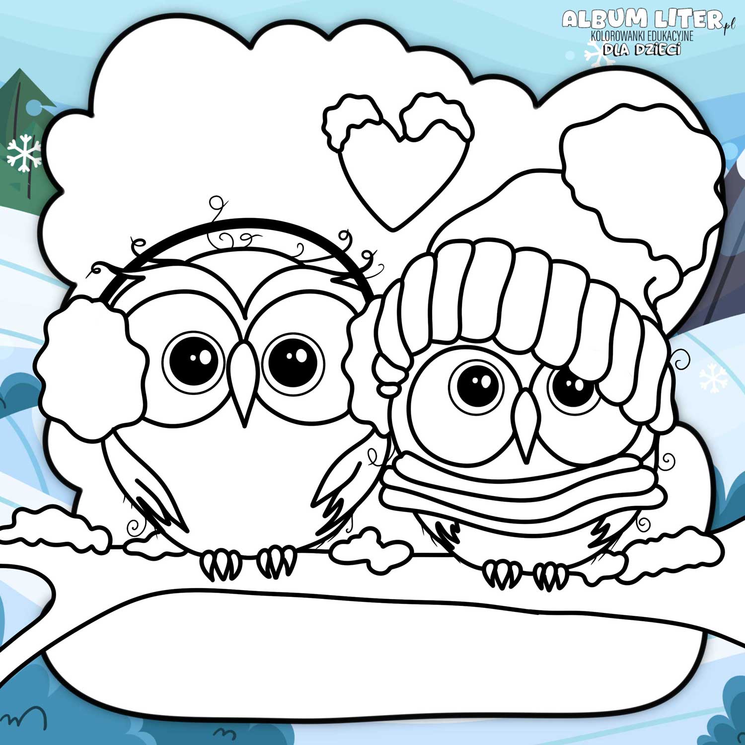 Zimowa Kolorowanka do Druku za Free. Dwie Przesłodkie Sówki w Ciepłych Nakryciach Głowy